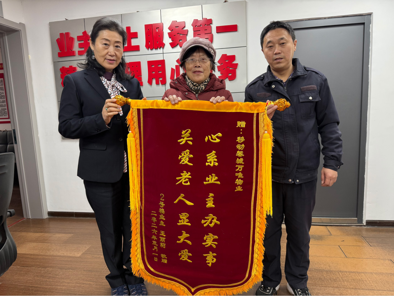 2月14日,移动馨城2号楼一位业主家老人不慎走失。秩维王主管和赵长安班长接到求助后,迅速骑电动车外出寻找,最终在应昌街成功找到老人。为避免老人受寒,他们贴心安排出租车,将老人安全护送到家,亲手交予家属。其高效负责、细心温暖的处置,获得了业主的高度赞誉,业主近日特赠锦旗“心系业主办实事 关爱老人显大爱”以示感谢。 王主管和赵长安班长用实际行动展现了我们物业人高度的责任心和“业主至上”的服务精神。集团号召全体员工以他们为榜样,将“业主至上 服务第一”的服务理念融入日常工作的每一个细节,以更高的热情、更优的标准、更实的作风,服务好每一位业主。