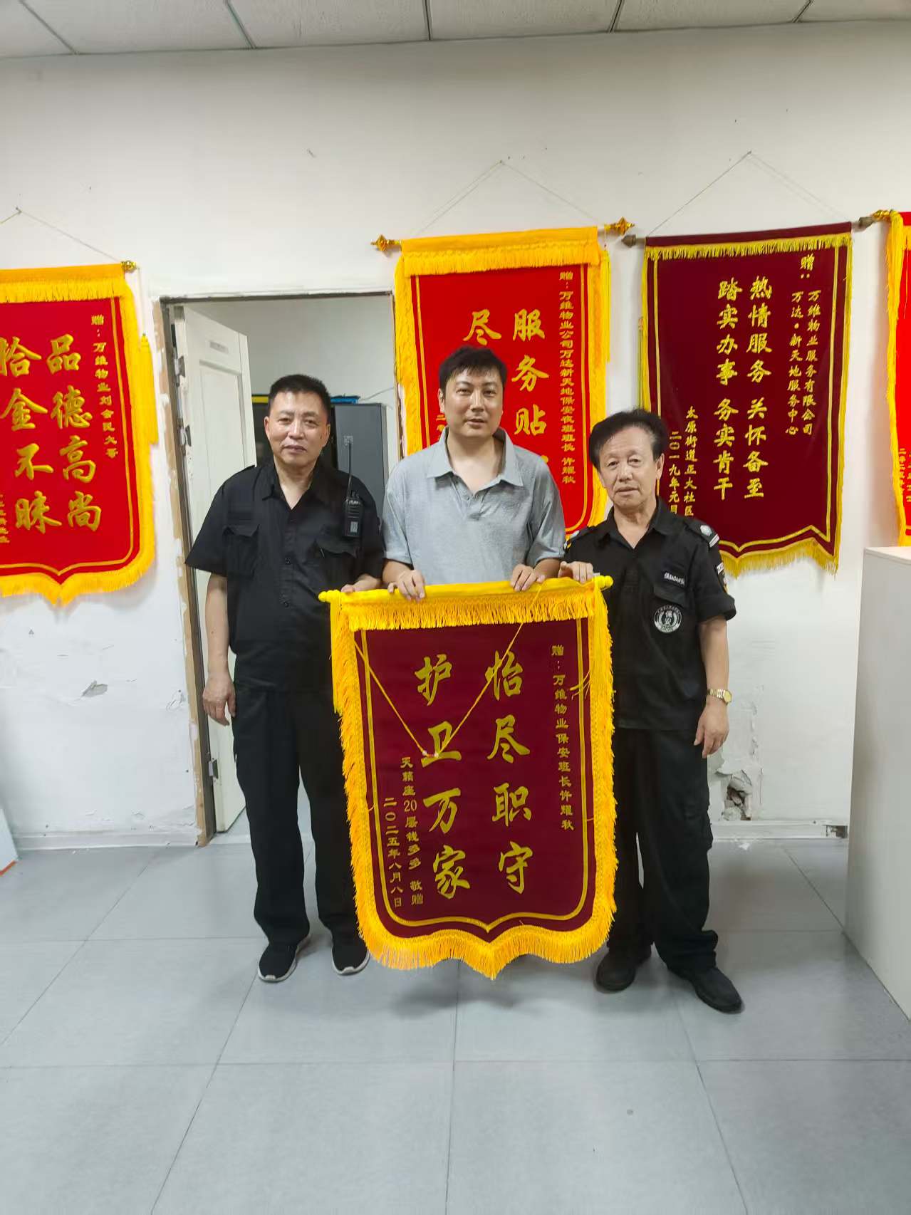 近日,万达新天地项目夜班秩序维护班长许耀秋同志以实际行动诠释了"用心服务"的真谛。在完成本职工作的同时,他主动为天籁座20层业主提供延伸服务,不仅协助清理装修垃圾,更不辞辛劳帮忙搬运新购家具。这一暖心举动赢得了业主的高度赞誉,业主特赠送“尽职尽责 护卫万家”锦旗以示感谢。