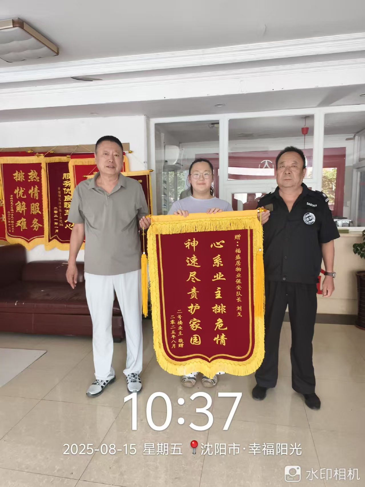 业主深受感动,特赠送“心系业主排危情 神速尽责护家园”锦旗一面,以表达对刘戈同志及物业服务中心的诚挚谢意。