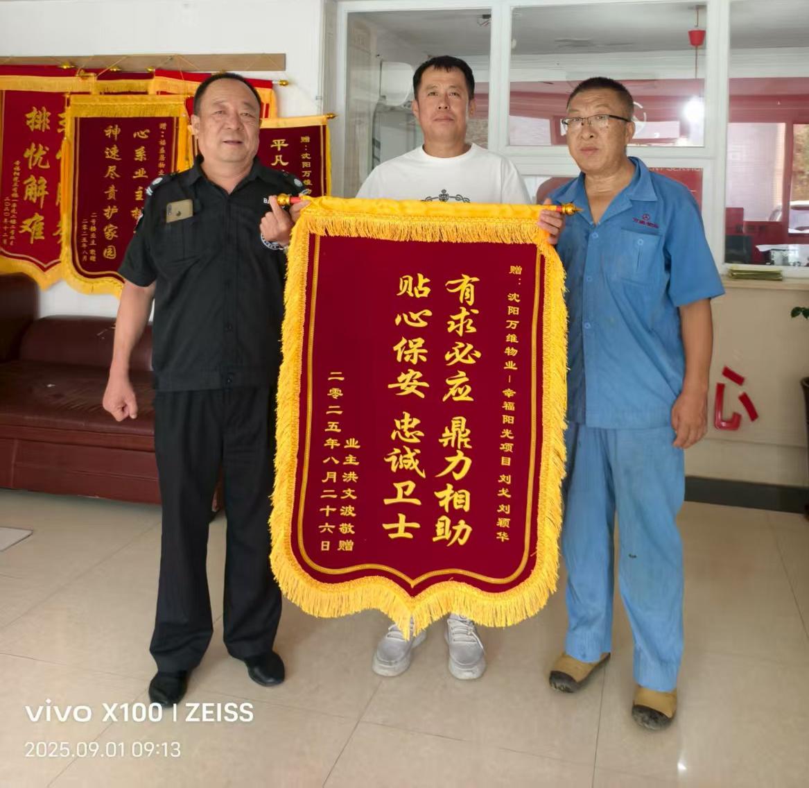 业主深受感动,特赠送“有求必应 鼎力相助 贴心保安 忠诚卫士”锦旗一面,以表达对刘戈、刘颖华同志及物业服务中心的诚挚谢意。